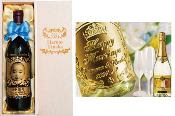 お酒のボトルにデザイン名入れの彫刻加工が可能です。ラベルと違い直接彫刻するので、色褪せもしにくく飲み終わった後も飾っておくことができます。