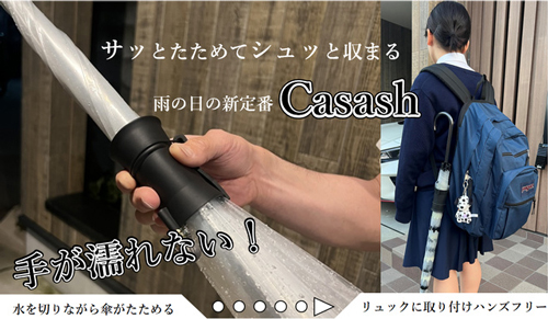 手を濡らさず綺麗に傘をたためる専用ホルダー「カサッシュ」。他人に水がつかない、置き忘れを防くなど、活用法多彩なオリジナル商品です。新商品「カサッシュプラス」はリュックなどにも取り付け可能。手ぶらで傘をさせる新しいライフスタイルを提案します。