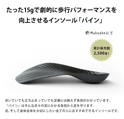応援購入総額2千万円超え!立体形状によるフィット感と足圧分散機能を持った「バイン」は、足裏の動きに沿ってしなやかに沈み込んで押し返す、程よいバネ効果により、弾むような歩行を実現。体重移動がスムーズになり、足裏の疲労軽減をサポートします。
