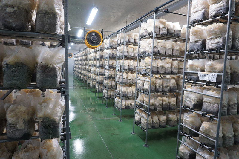 ナラやカラマツなどの間伐材のおが粉やチップに、米ぬかなどの栄養体を加えて菌床を作り、そこでキノコを育てる「菌床栽培」に取り組んでいる。主力商品のシイタケやキクラゲに加え、2020年から新たにつくり始めたハナビラタケの生産量は前年度170トンに達した。