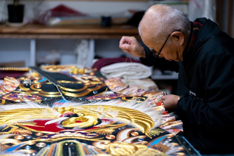 「株式会社佐渡村衣裳店」の代表、佐渡村孝明さん(57)は15年前、看板製作会社のサラリーマンを辞め、神楽の衣装づくりと修理を続けている。衣装の重さは15~20キロ、値段は250~300万円にもなる。金糸を縫い留める金駒刺しゅうや絵柄を盛り上げる立体刺しゅうは独自の技法だ。修理に持ち込まれる戦前の衣装などを分解しては先人の技法を学び、京都・祇園祭の山鉾(ほこ)の関係者や歌舞伎に関わる職人たちとも交流して助言を受けている。