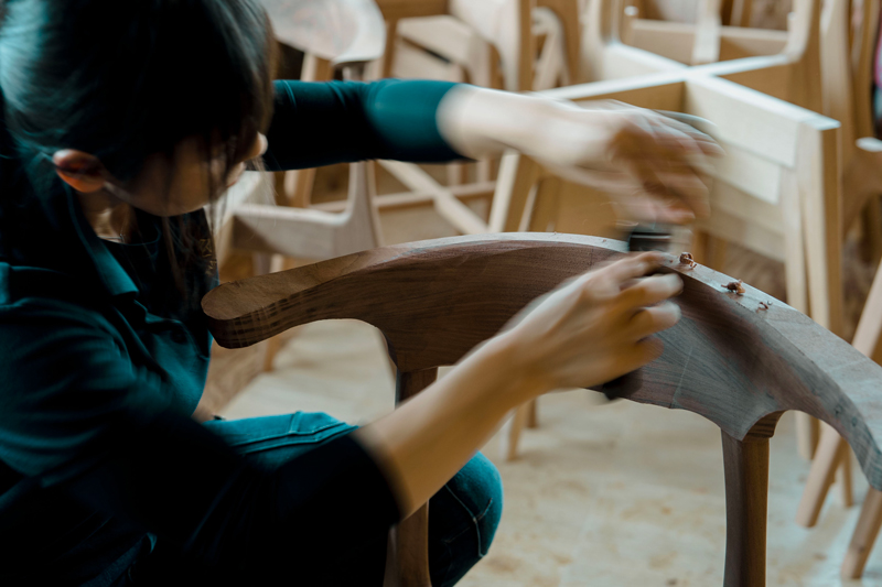 イスは、家具づくりの中で最も多くの工程があり、その数は50以上にものぼるとされる。それぞれの工程を専門の技術者が分担してつくるのが一般的だが、匠-TAKUMIの家具職人・長内優依さんはすべてを一人でやりきる。